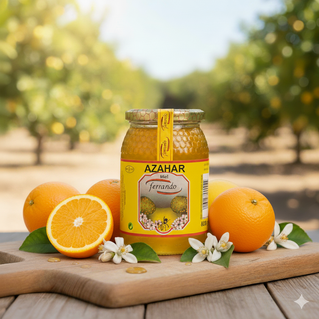 Miel de Azahar (Miel del naranjo, Citrus aurantium, c. Vulgaris). Miel fina y delicada, típica de la zona de Valencia, de color ambar claro y dorado. Su gran aroma y sabor, hace que esta miel sea deseada en todas partes del mundo.